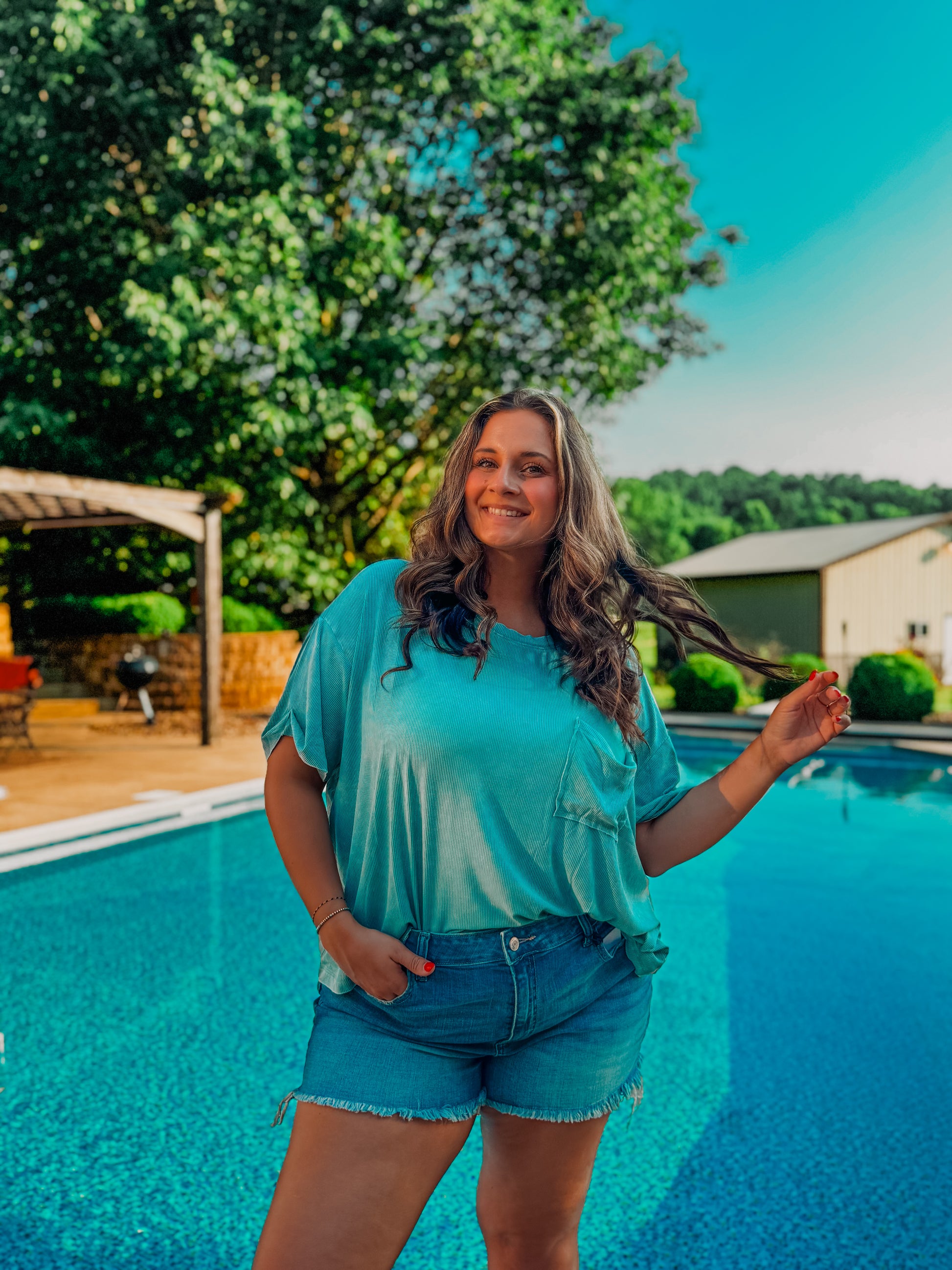 PLUS WASHED RIBBED CUFFED SHORT SLEEVE ROUND NECK TOP - STRETCH RIBBED FABRIC - A FRONT POCKET - BACK PATCH